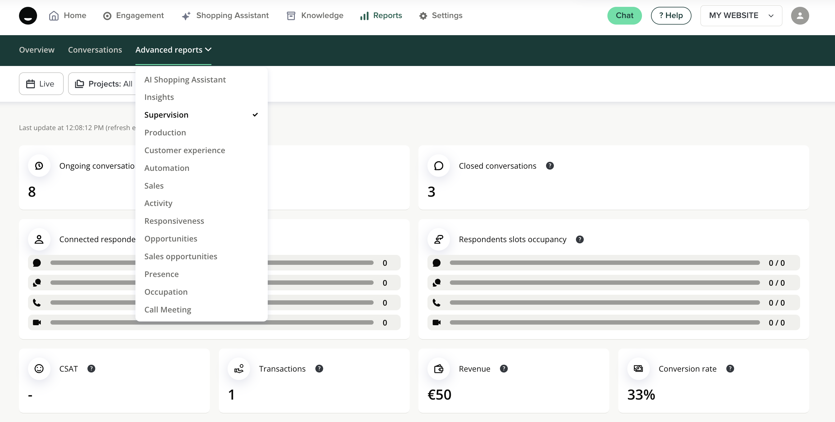 The Supervision report is one of iAdvize's two real-time reports, along with the Production report. As a manager or admin, if you work with and manage a team of respondents, you'll find it invaluable for monitoring the day's activity and your team's breakdown at a glance, and for tracking your respondents' individual performance throughout the day.