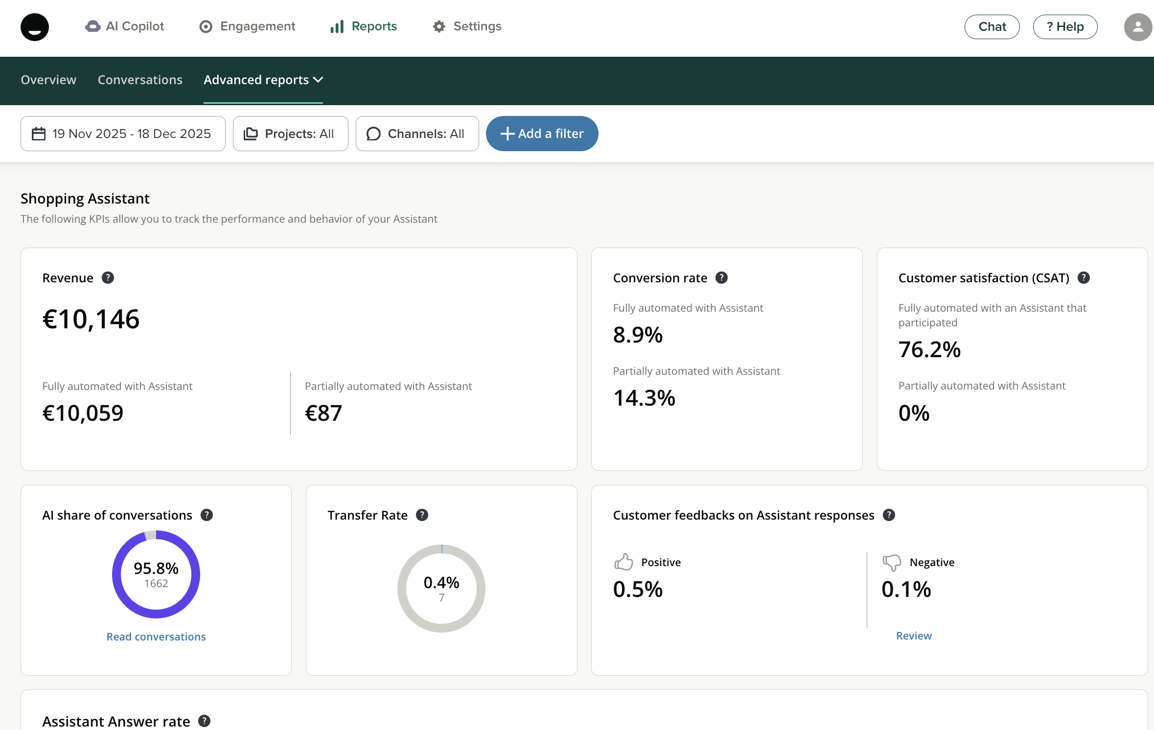 - The CSAT of fully automated conversations, where only the Assistant interacted with the visitor, - The CSAT of partially automated conversations, where the Assistant contributed to part of the exchanges with the visitor. |