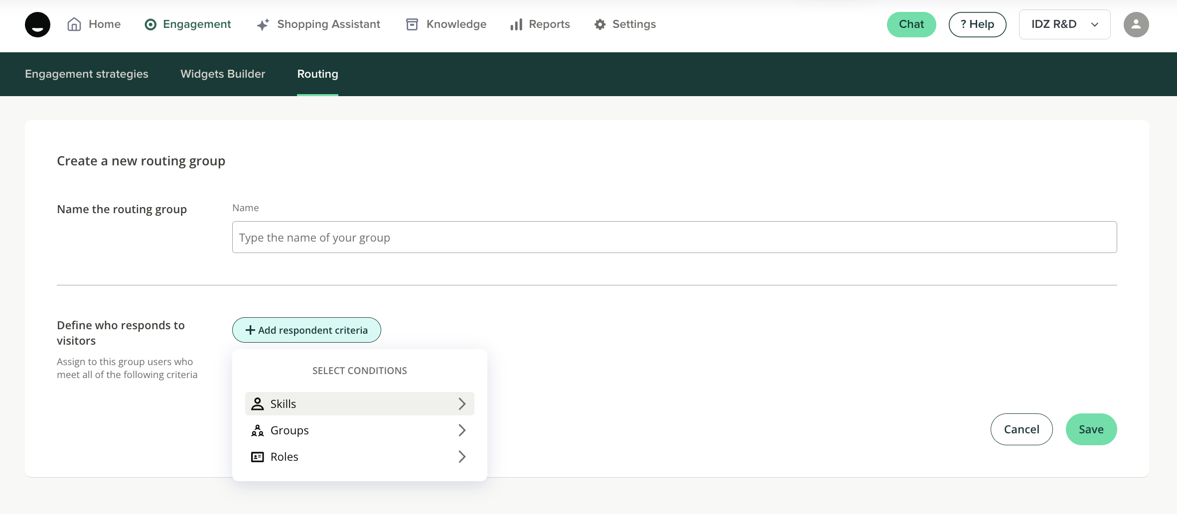 If your responders are advisors, organize your teams by grouping them by role, group or skills. These groups are essential to define which responders will receive conversations. An advisor can be added to multiple routing groups.