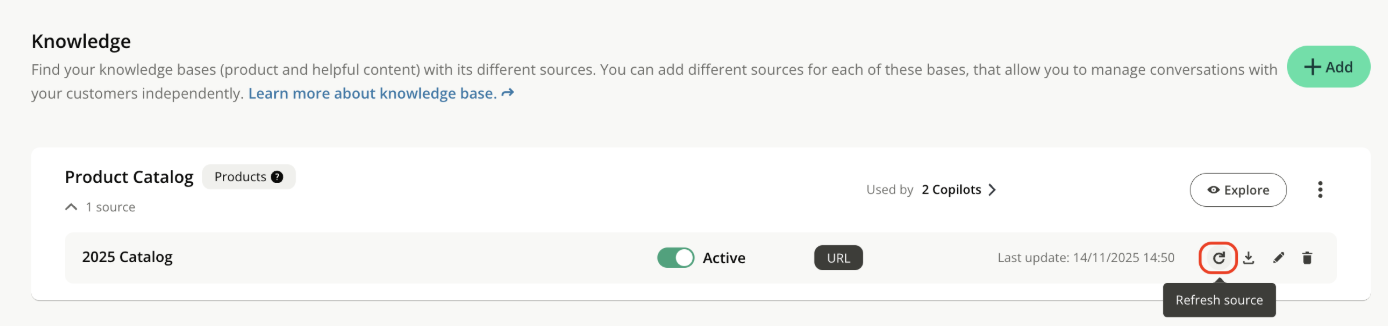 - If your catalog is automatically synchronized (URL, Shopify, etc.): update the content on your website. An automatic refresh occurs daily. You can still force an update by clicking “Refresh source” in Knowledge: