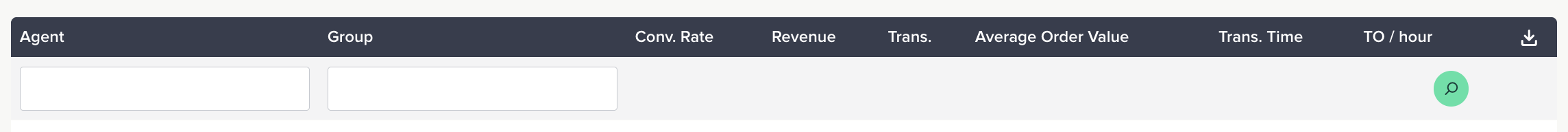 Filter data based on results desired. You can apply a filter per channel, type of view (agent, type of contact, group, rule, page type or transaction) and date.