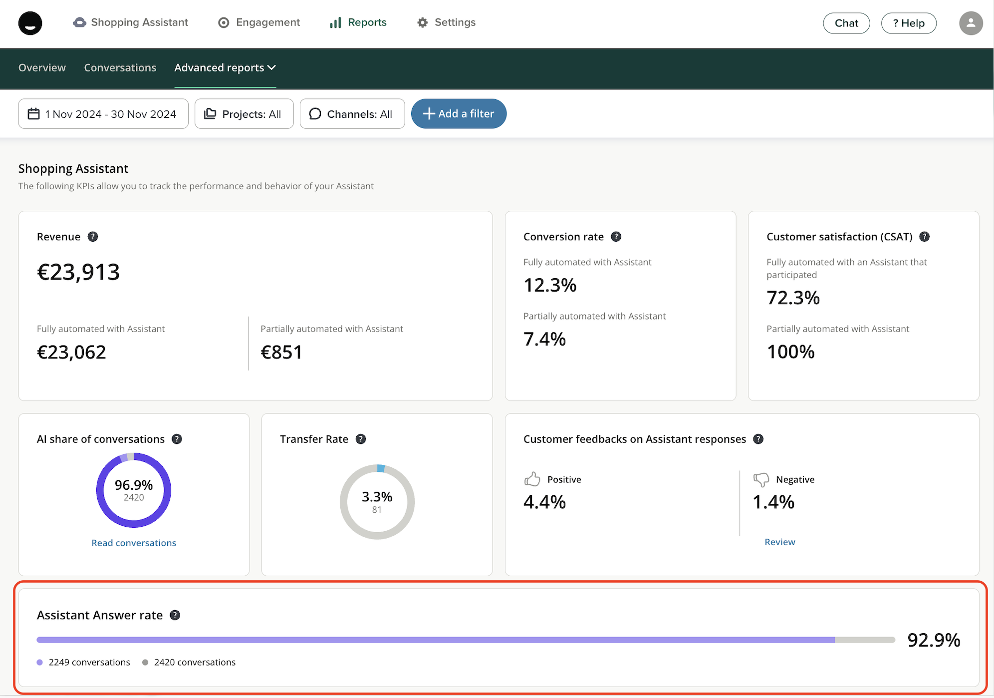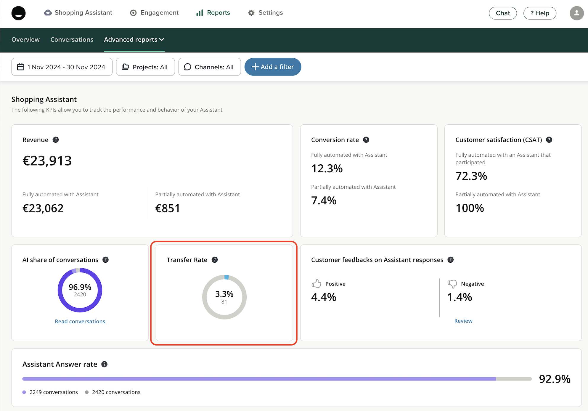 This metric indicates the share of conversations that started with your Assistant and were then transferred to a human advisor. It should also be interpreted in light of your overall response strategy: are you aiming for a fully autonomous Assistant, or do you want to facilitate escalation to human advisors?