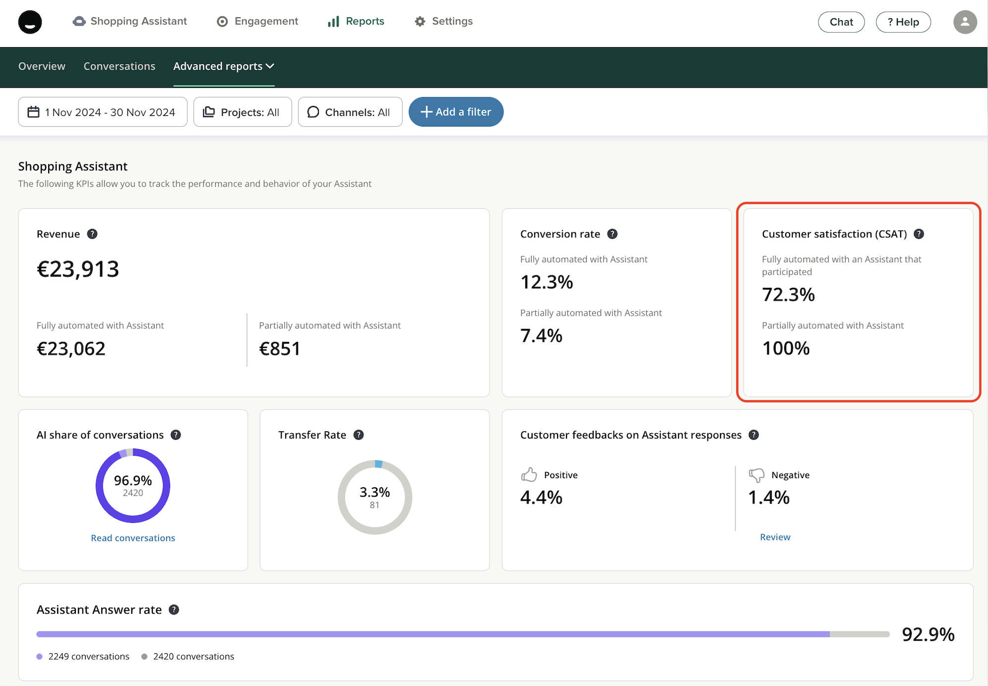 A low CSAT (below 60% for an Assistant) should prompt you to take a closer look at other quality indicators.