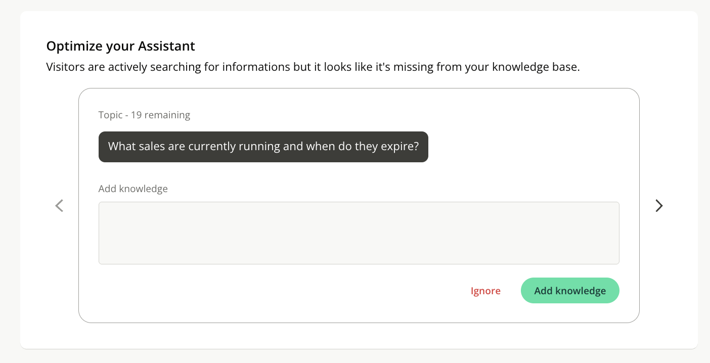A continuous optimization of your knowledge base enables your Assistant to be more autonomous and to answer visitors more effectively, thereby improving both its response rate and visitor satisfaction.