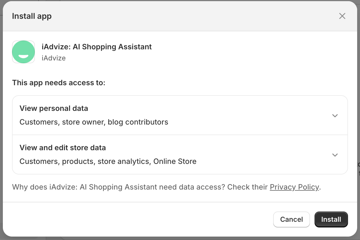 Authorize iAdvize to access your store's product and variant data, then click Install: