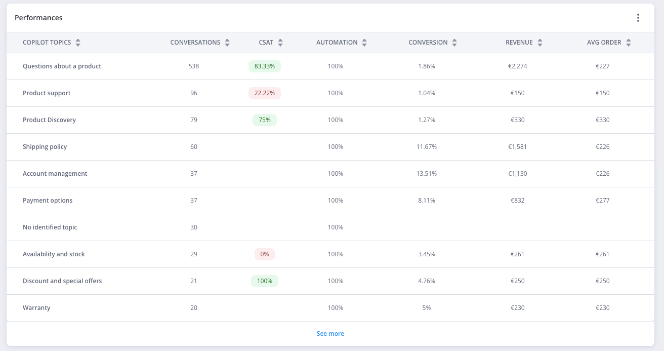 This section details the performance of your conversations according to your different topics, allowing for a deeper analysis of your results.