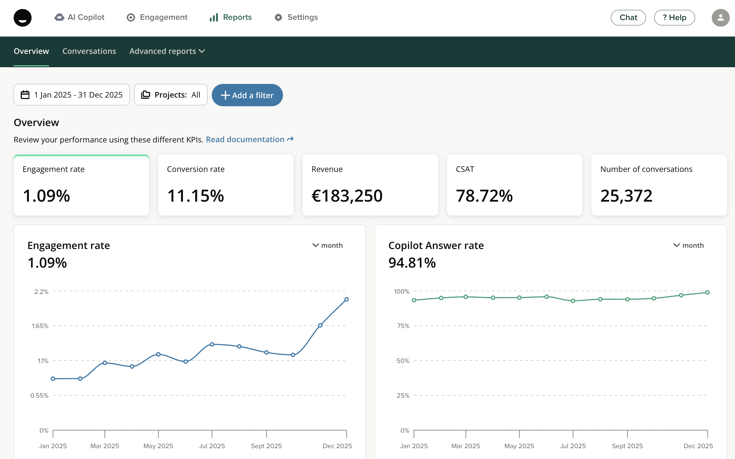 The Conversations column includes all handled interactions. A single conversation can be counted both for your Copilot if it initiated the chat with the visitor, and for your agents if several of them took part in it.