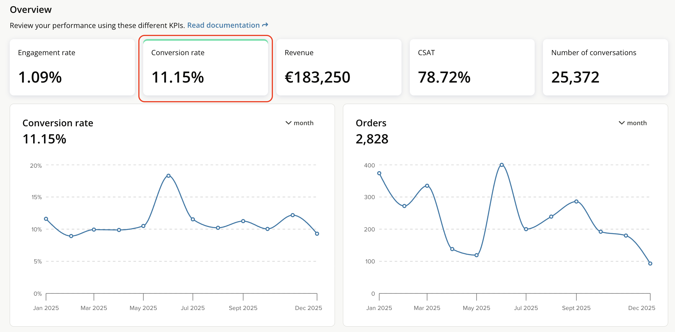 This indicator shows the percentage of conversations that resulted in a transaction (Number of transactions / Closed conversations).