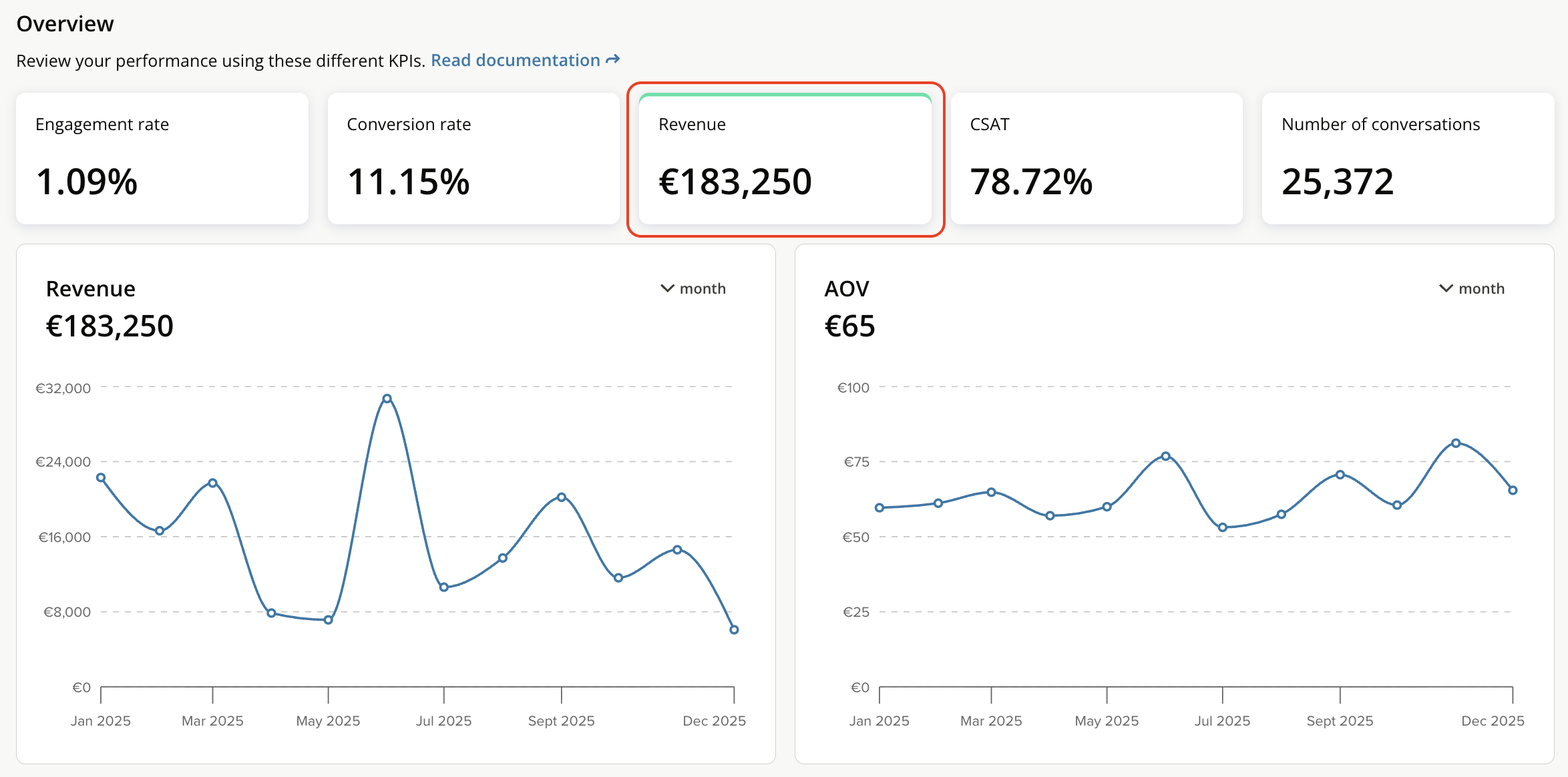 The Overview Report provides an overview of key indicators, including metrics such as conversion rate, revenue, automation rate, and customer satisfaction (CSAT). It enables the analysis of overall performance and tracks the evolution of results through interactive charts and detailed tables by category, offering an essential tool for monitoring and optimizing performance in alignment with defined objectives.