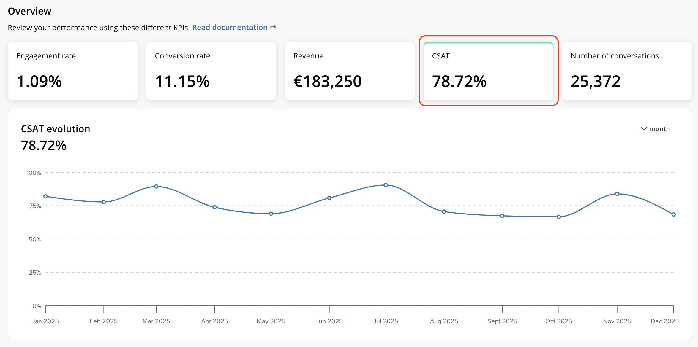This indicator shows the percentage of customers satisfied with the conversations they had with an agent, whether it was a professional agent or a bot.