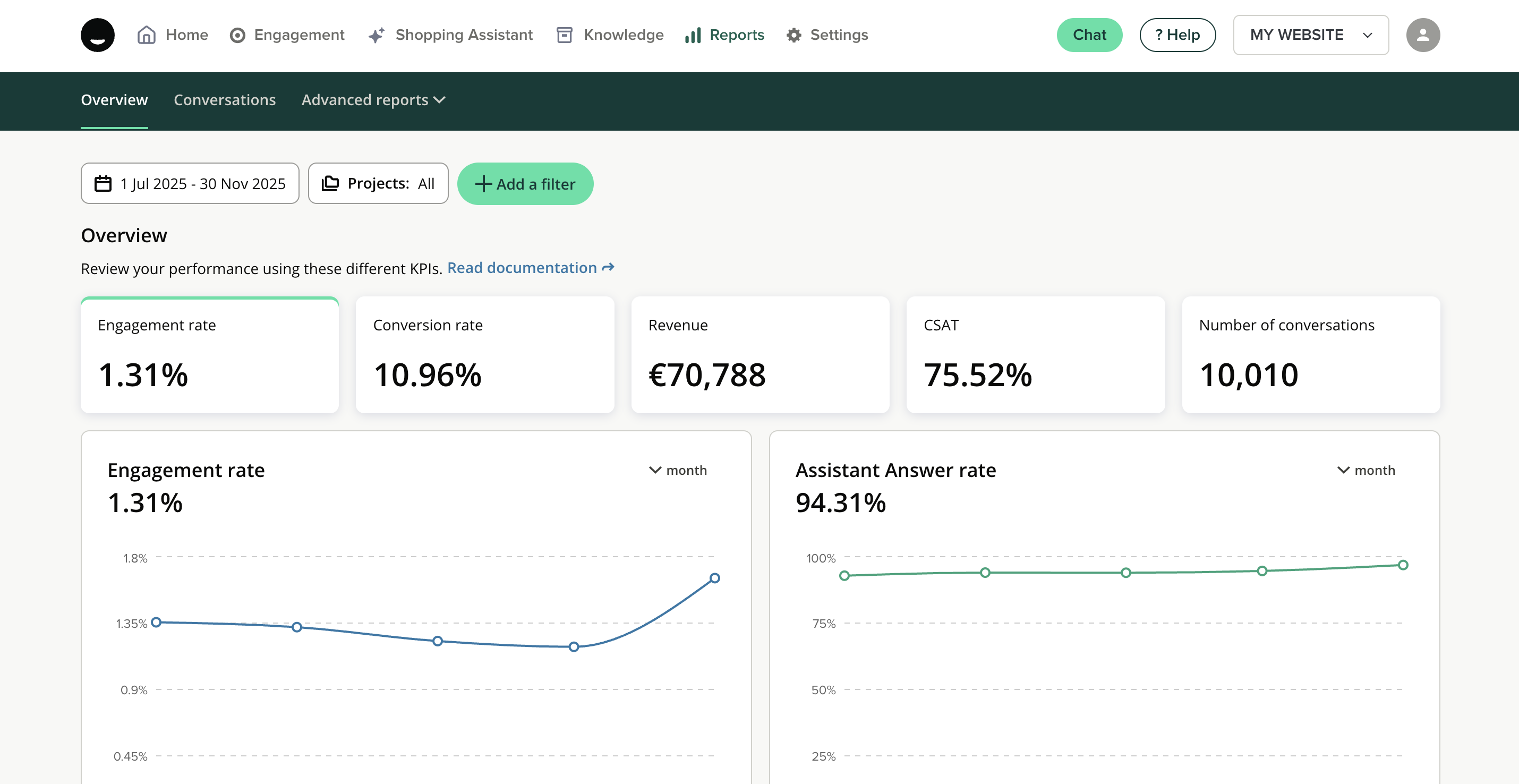 The Overview Report provides an overview of key indicators, including metrics such as conversion rate, revenue, automation rate, and customer satisfaction (CSAT).