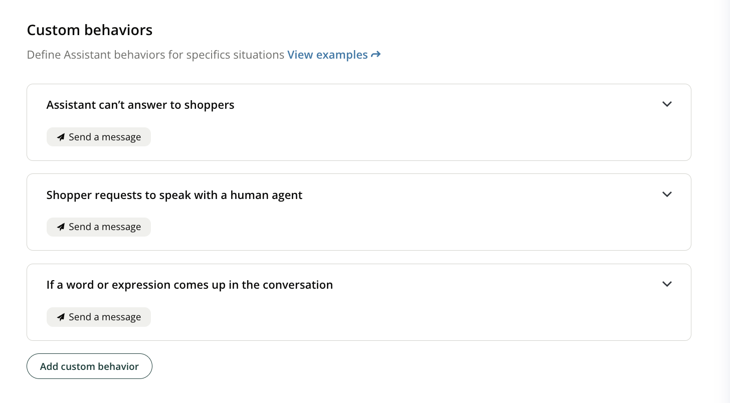 Custom Behaviors allow you to finely adjust your Assistant to your brand’s specific needs by designing tailor-made use cases. While the Assistant efficiently handles general shopper inquiries, certain situations require personalized responses, such as processing specific requests or transferring to a human agent for sensitive topics. This feature gives you the flexibility to configure your Assistant for more precise and adapted interactions.