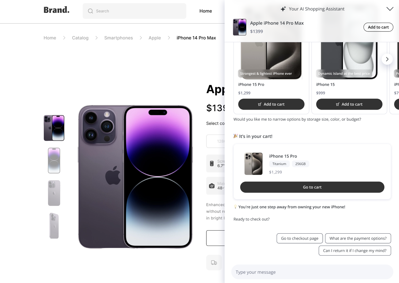 - The visitor clicks on “Add to cart” without leaving the conversation.