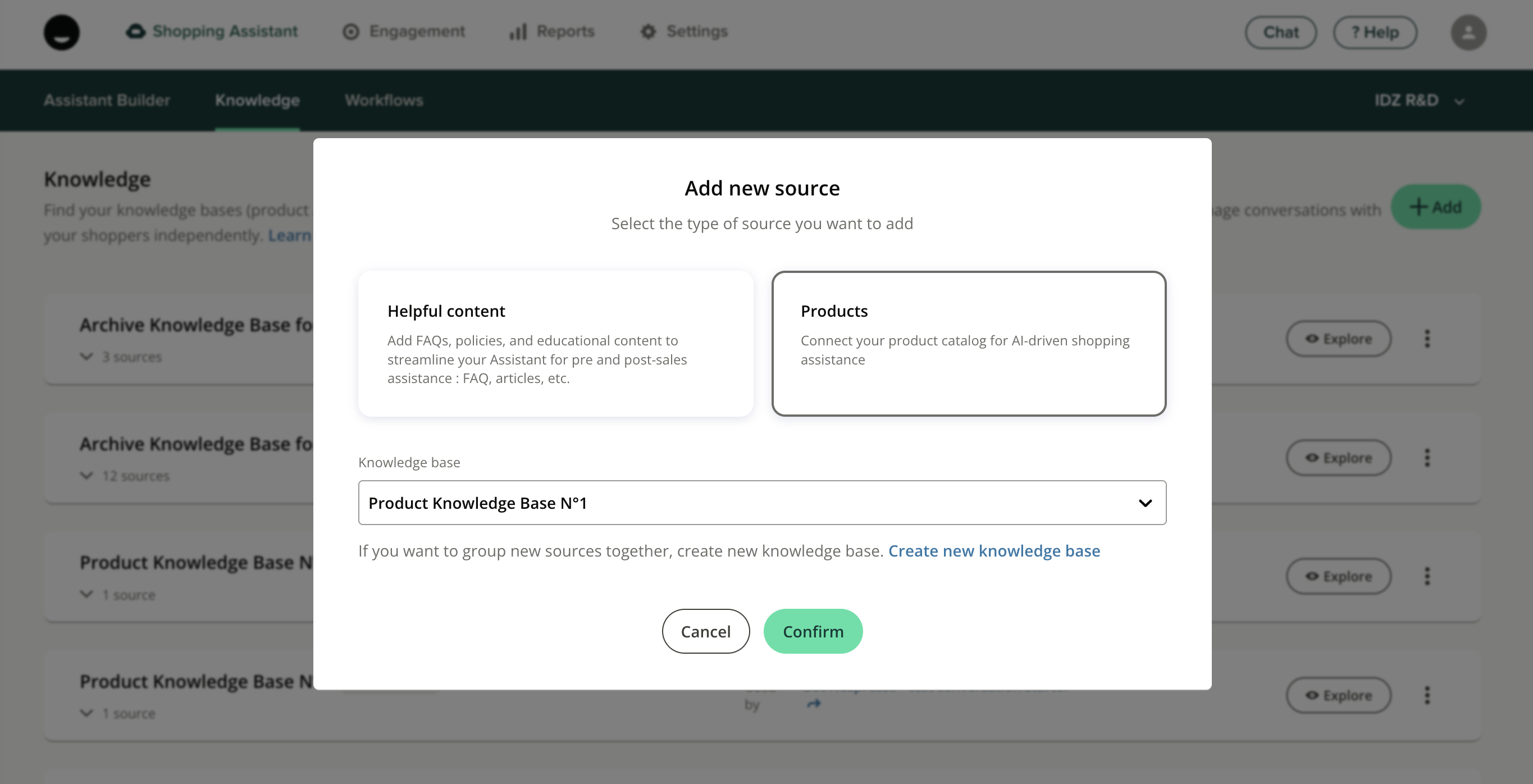 Click on Add, select the source type "Products", and choose the knowledge base under which to group the new source.