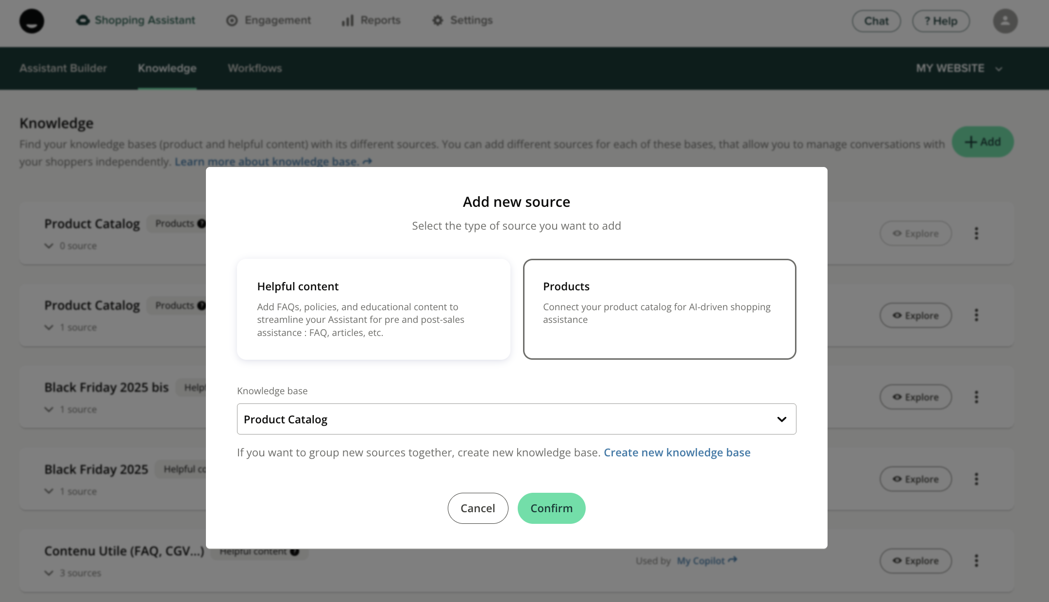Click Add, select the source type Products and the knowledge base where you want to group this new source.