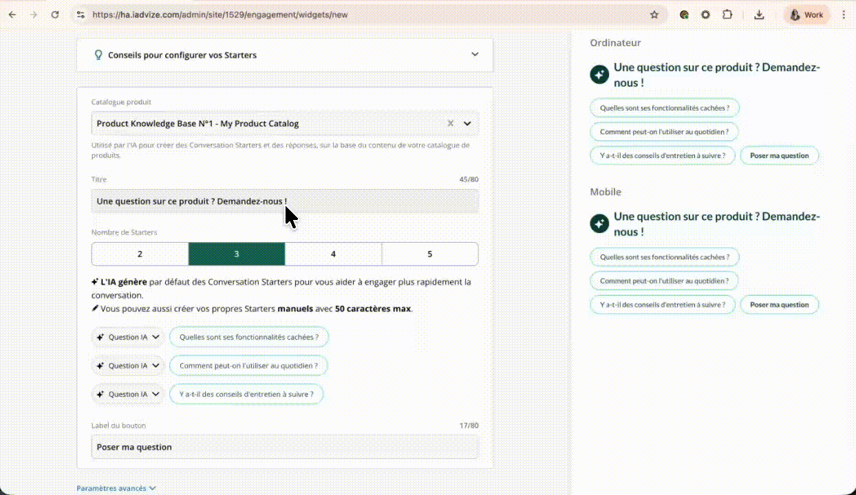 Example: if you enable Floating Starters in your configuration (desktop and mobile), your visitors on mobile will see a Badge displayed.