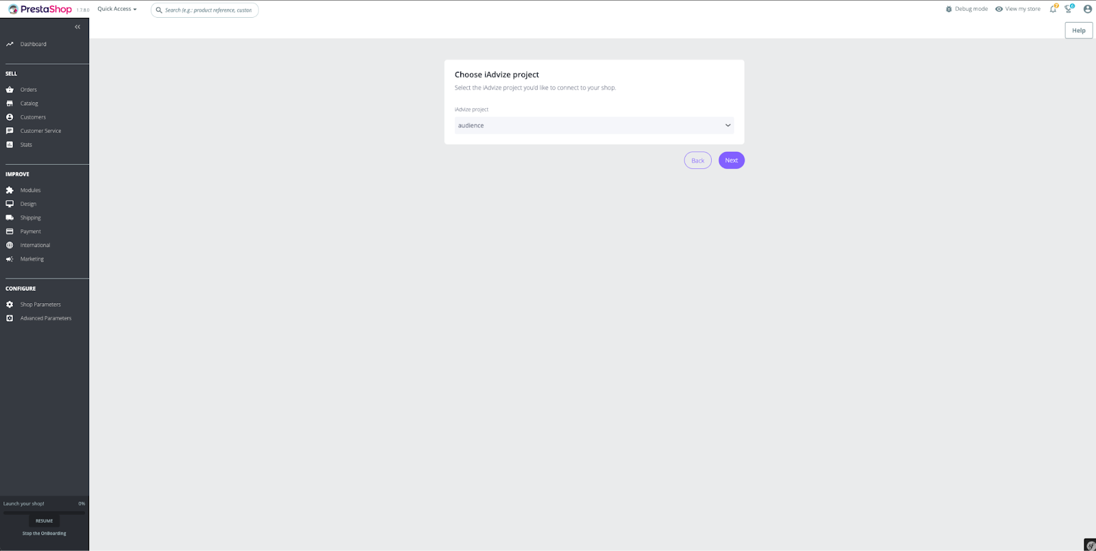 The iAdvize app is compatible with two versions of PrestaShop: 1.7 and 8. - Go to the Modules > Module Manager tab