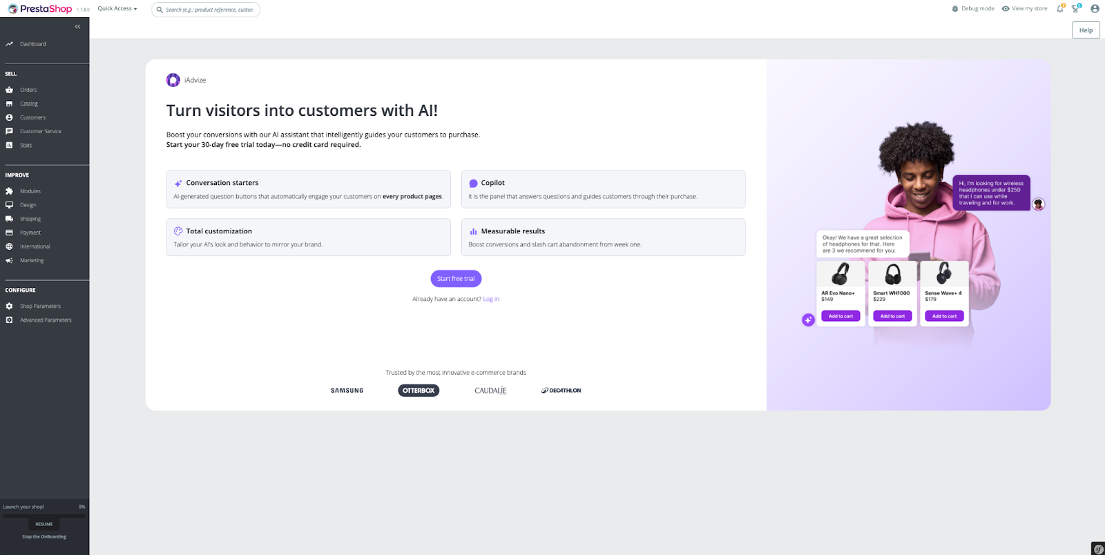 This guide explains how to connect your PrestaShop store to iAdvize to activate the AI Shopping Assistant on your e-commerce website in just a few clicks.