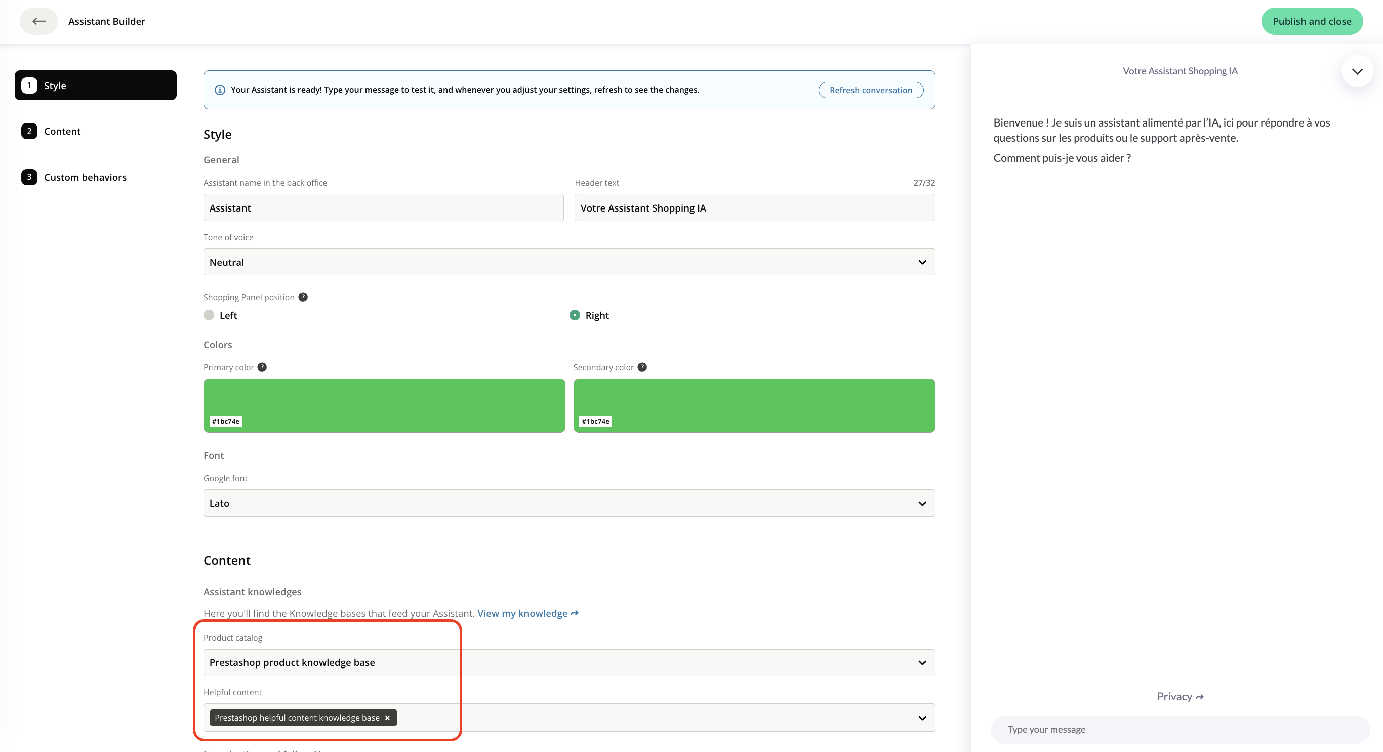 - Add your product catalog and useful content to your Assistant from the Content menu and publish your changes