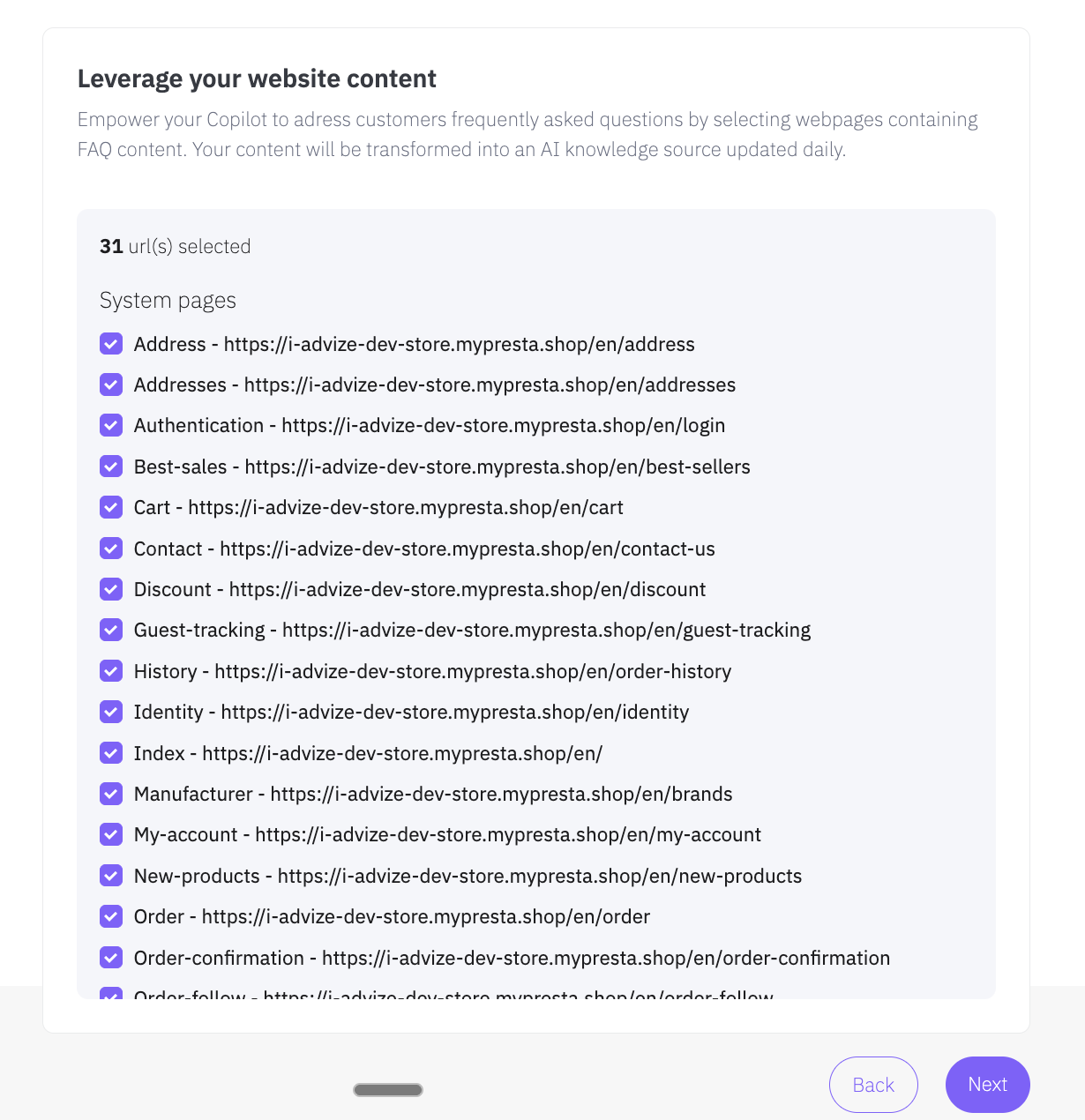 - Select the URLs to enrich the Useful Content of your AI Shopping Assistant.