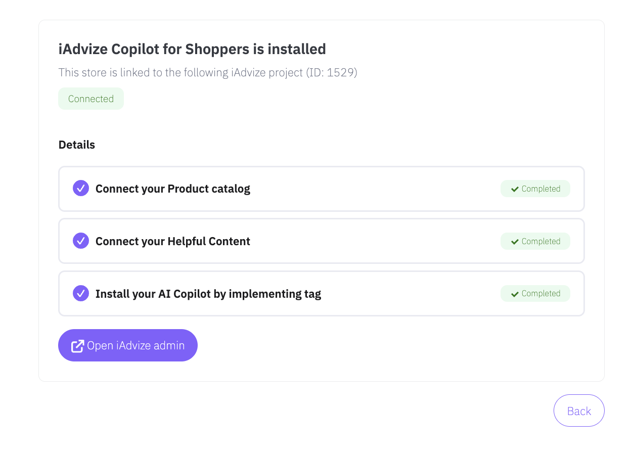 - The installation is complete. Tags are installed on your site and knowledge synchronization starts automatically in the background, with no further action required.
