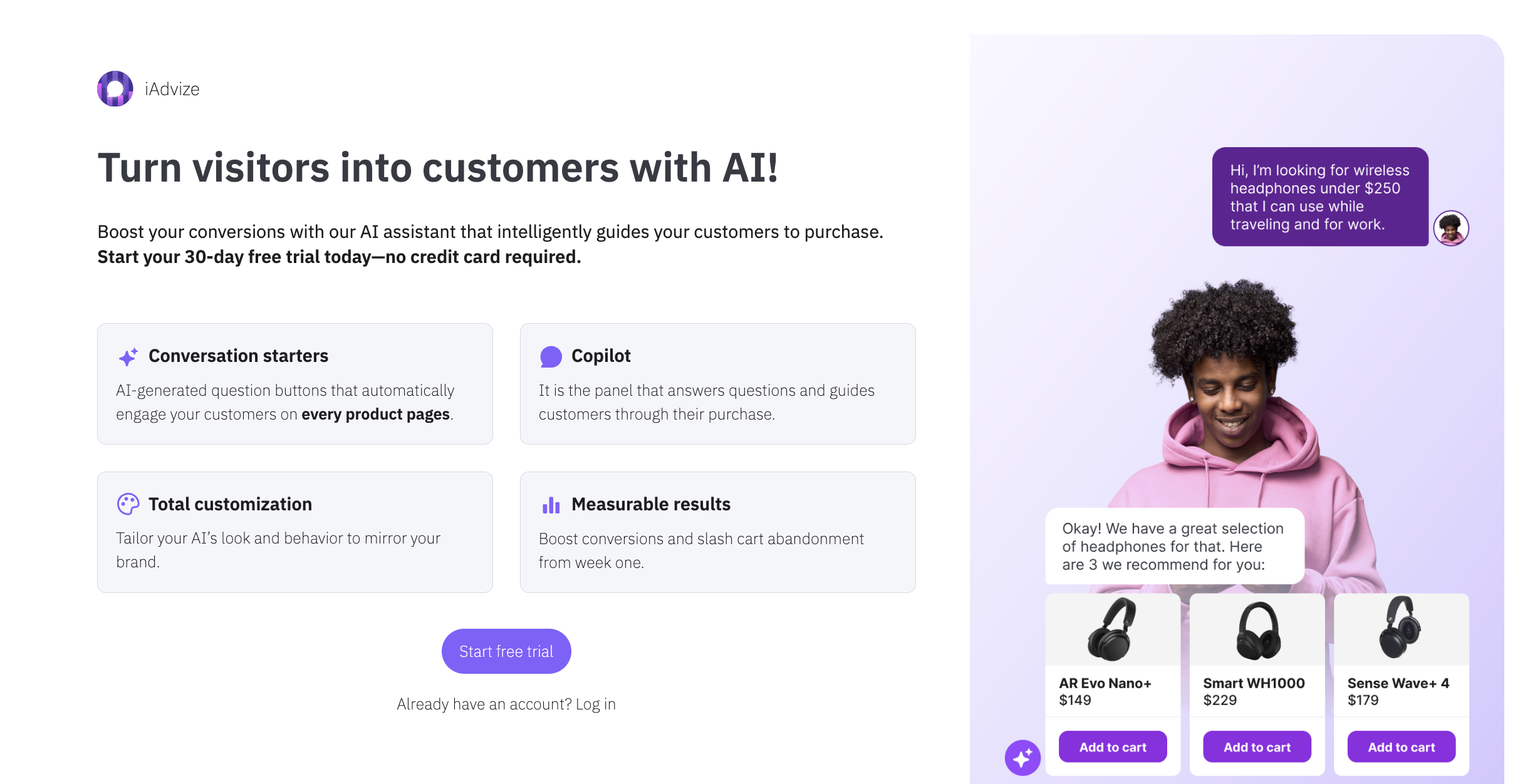 - If you already have an iAdvize account, click "Log in" and sign in with your iAdvize credentials