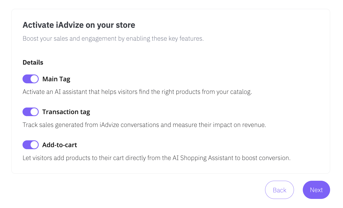 - Main tag (required): enables iAdvize on your site and activates your AI Assistant.- Transaction tag (optional): tracks sales generated by iAdvize and measures their impact on your revenue.- Add-to-cart (optional): allows your visitors to add products to their cart directly from the iAdvize conversation.