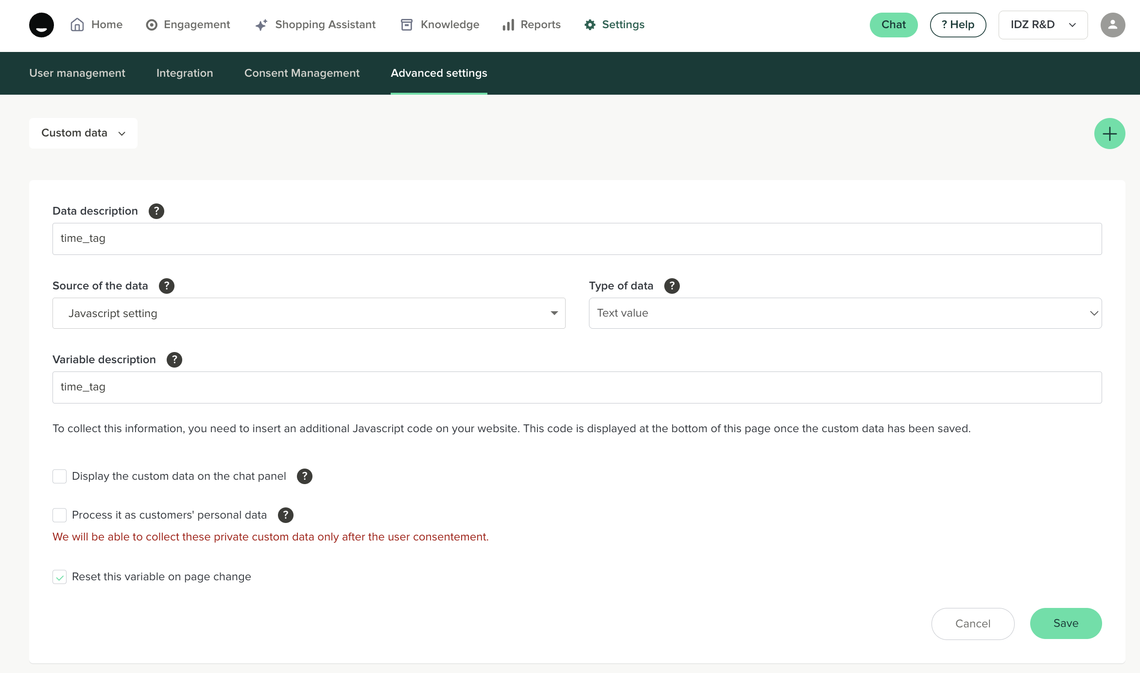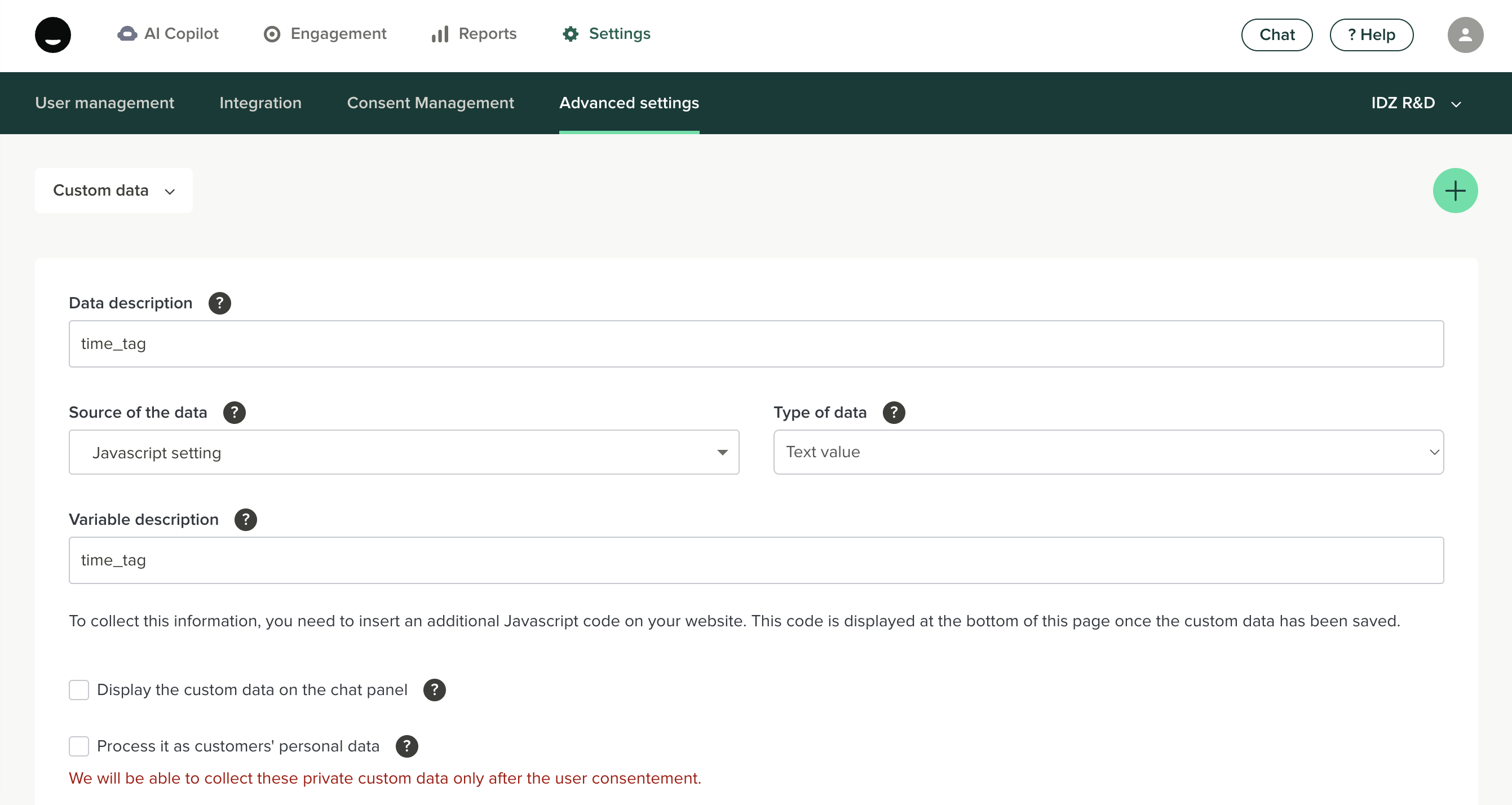 - Go to Settings > Advanced settings > Custom data