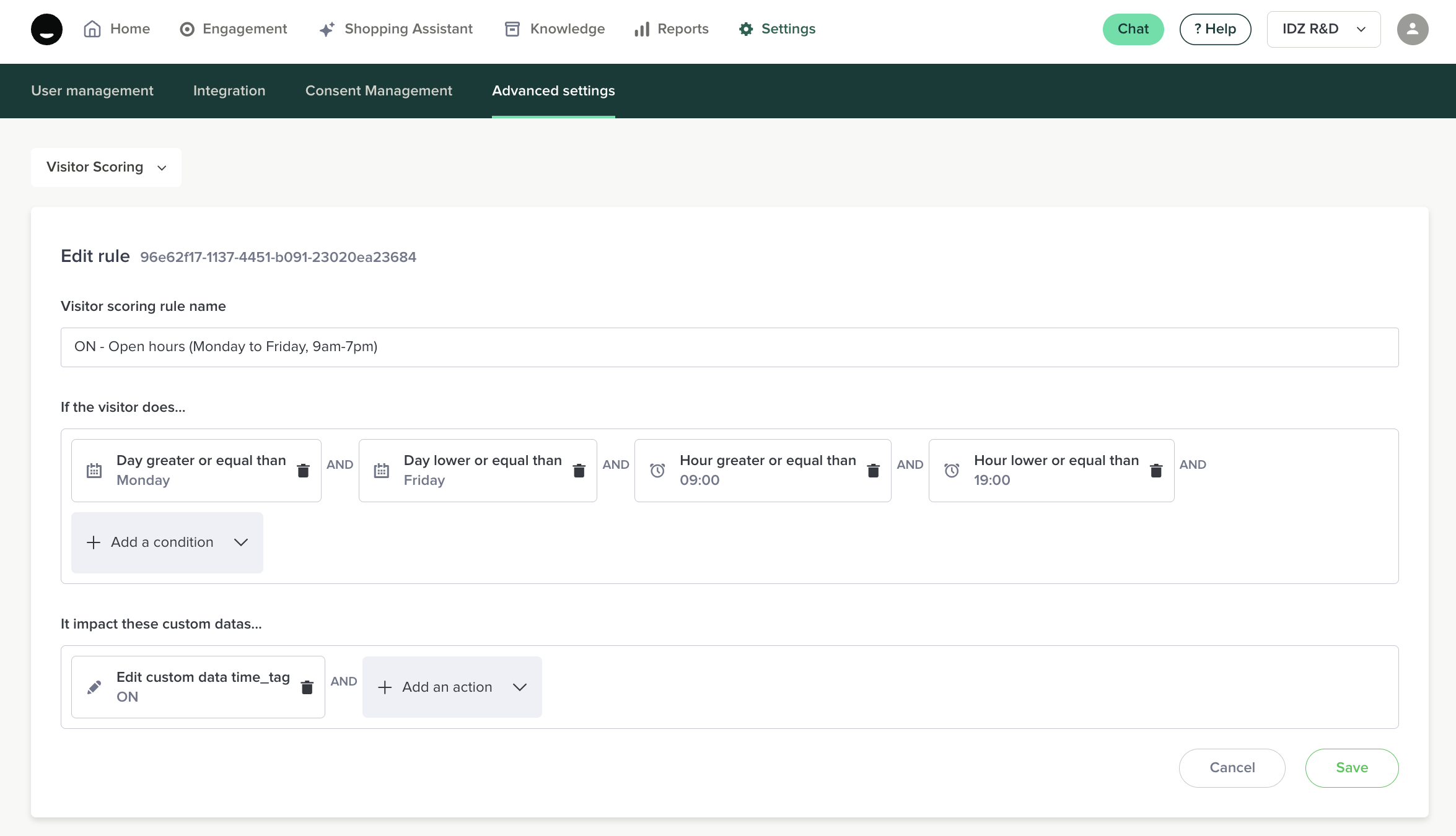 The time tag allows you to define iAdvize display time ranges based on the day or time, according to your preferences.
