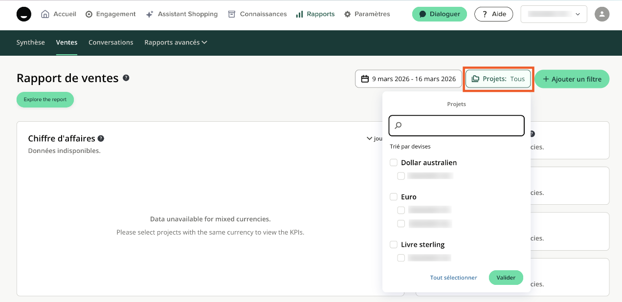 If the screen below is displayed, it means you have multiple projects (sites) with a different currency, by default all your projects are selected.