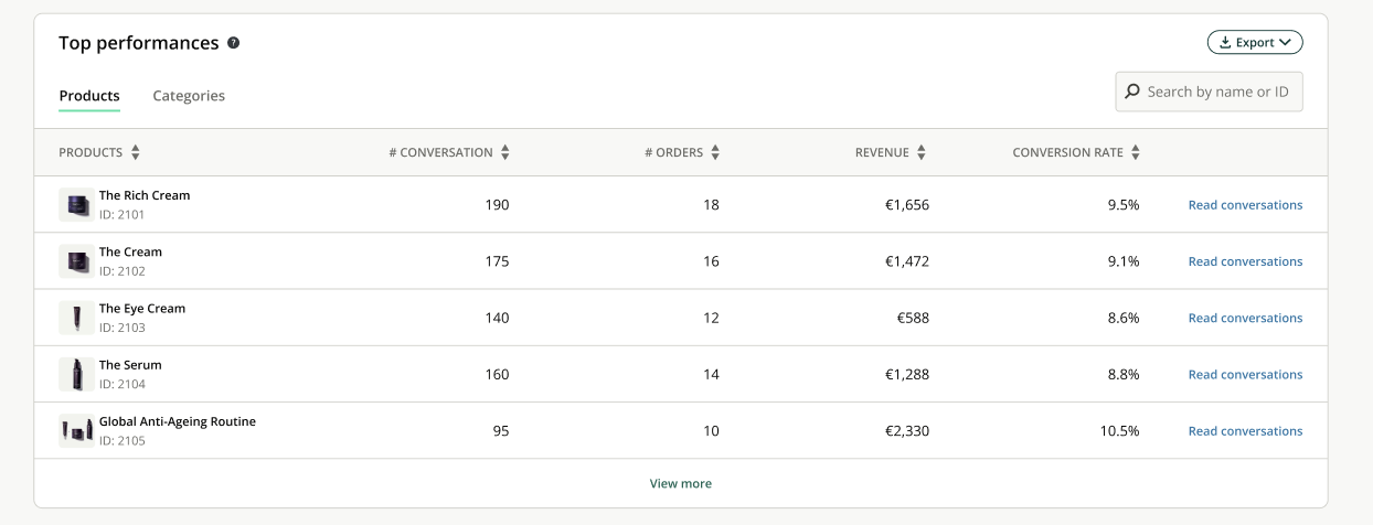 If a visitor purchases multiple products in the same transaction but only discussed one, the table will display only the amount of that discussed product, while the global metrics will count the total transaction amount. - Conversion rate : percentage of conversations that resulted in the purchase of this specific product