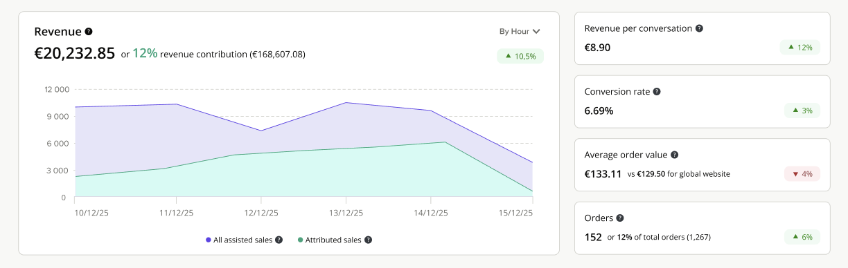 | Revenue per conversation | Average revenue generated by each conversation closed with the AI Assistant | Revenue ÷ Number of closed conversations |