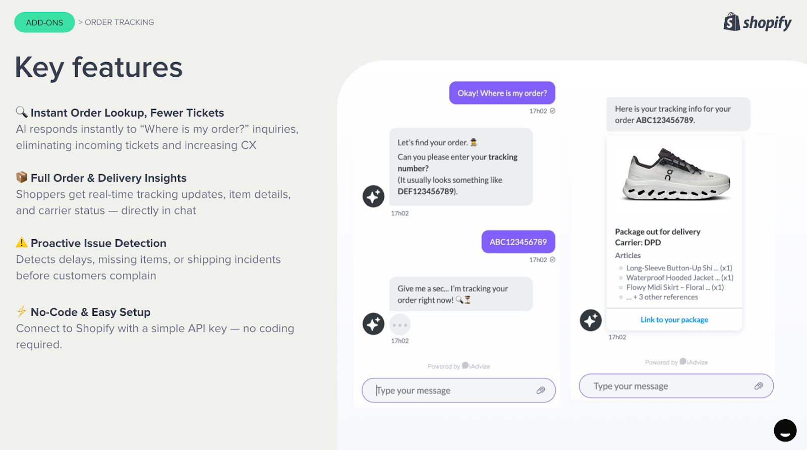 This guide walks you through setting up order tracking with Shopify. It details how to create a Shopify app, retrieve your API credentials, and install the iAdvize plugin that enables your AI Shopping Assistant to automatically respond to customer order tracking requests.