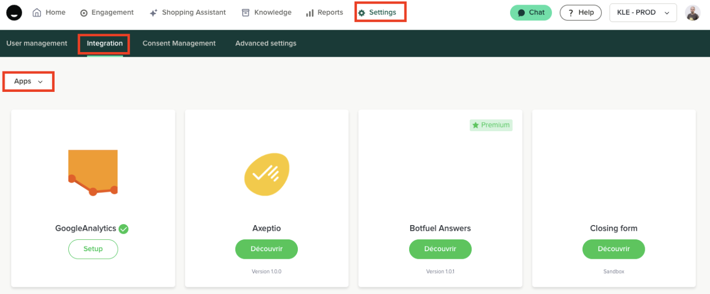 Go to the iAdvize app marketplace using the menu: Settings > Integrations > Apps.
