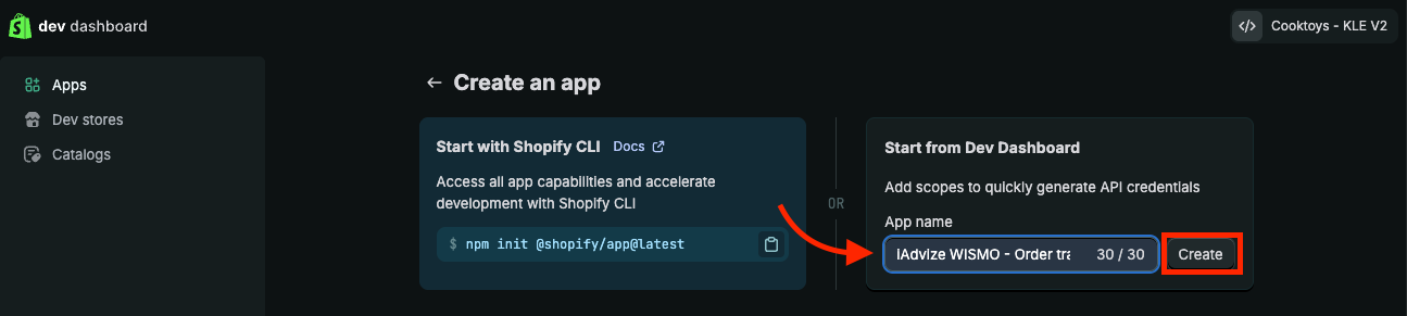 - Name your new app, for example "iAdvize WISMO - Order tracking", then click "Create"