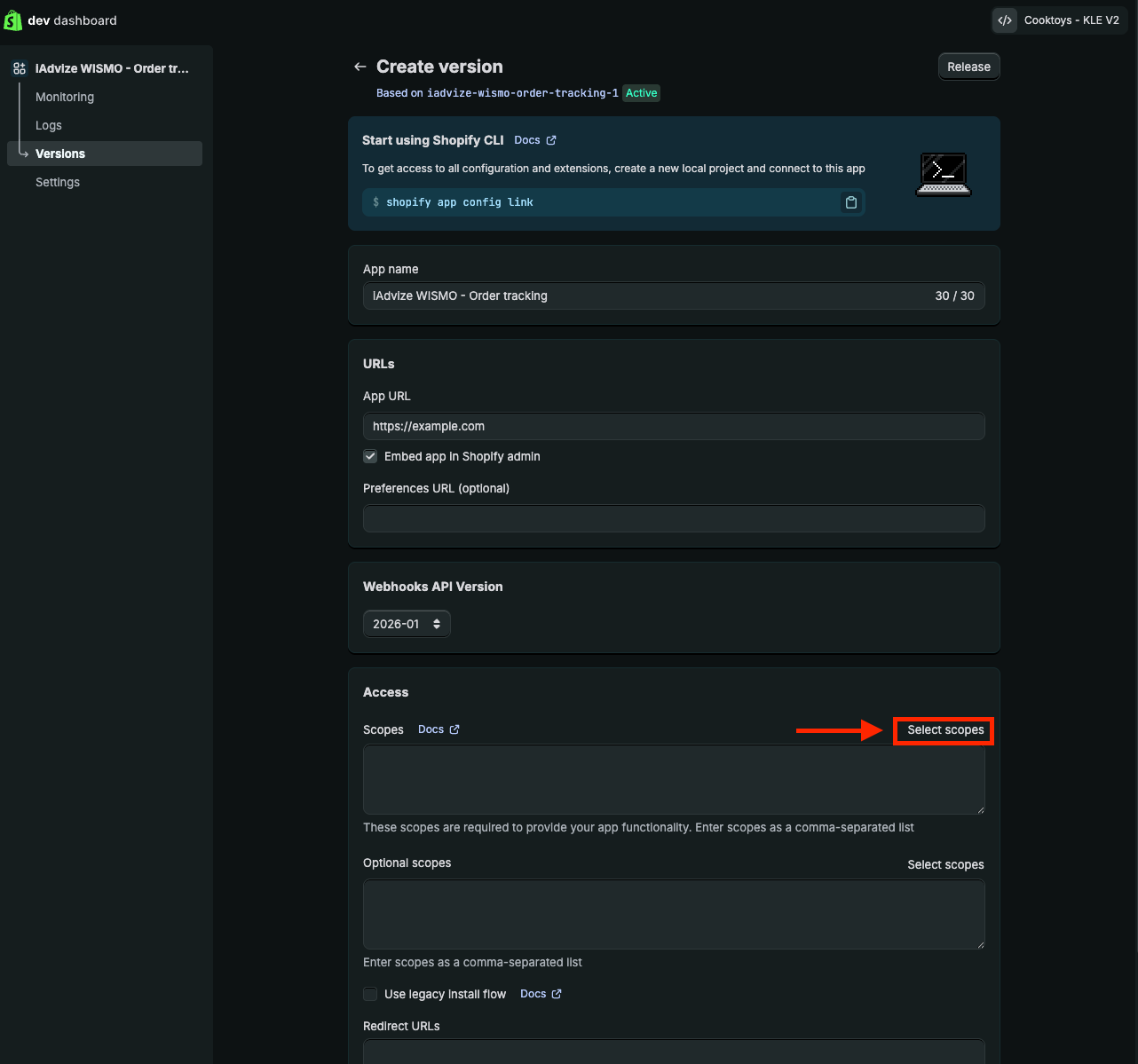 - Once the app is created, you need to assign access scopes corresponding to the resources iAdvize must access to retrieve order information.