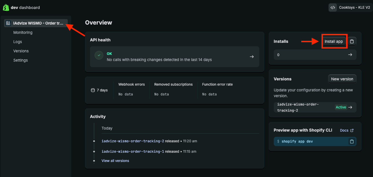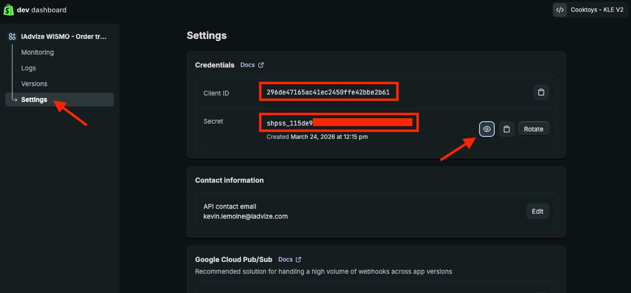 - Before installing the app, go to your app settings to retrieve the Client ID and Secret (starts with shpss_xxx) that will be needed to install the WISMO Shopify plugin from the iAdvize marketplace. To view the Secret, click the eye icon.