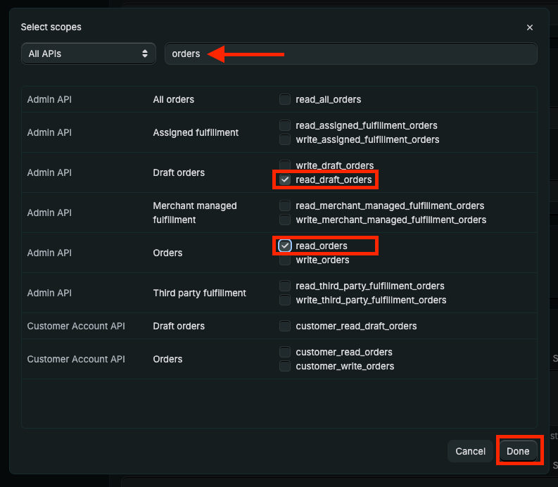 - Use the search engine to search for the keyword "orders", then check the read_draft_orders and read_orders scopes.