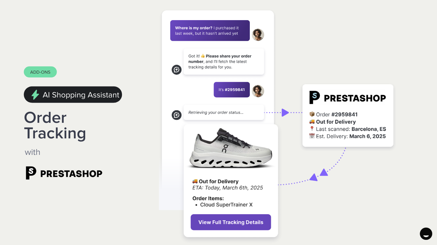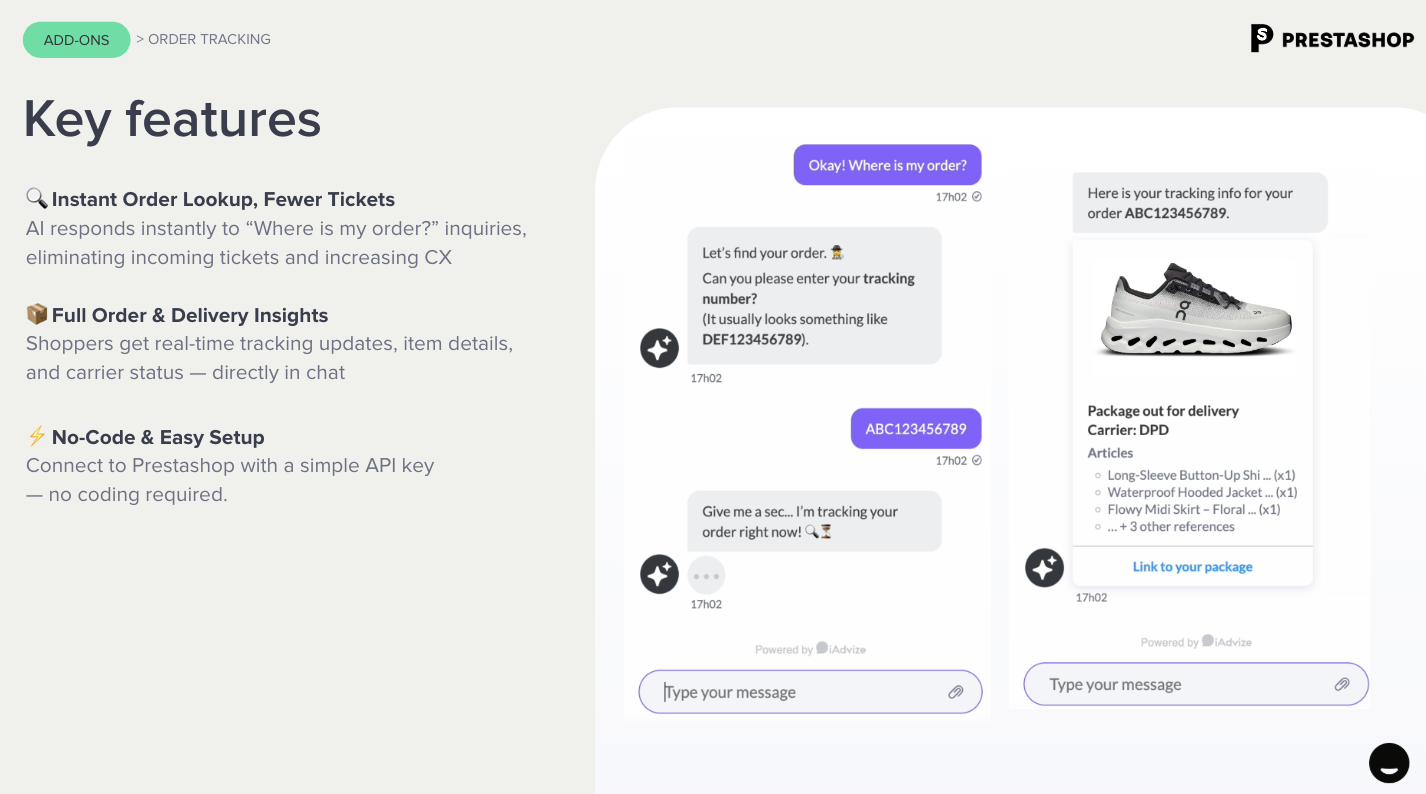 The Prestashop - order tracking plugin enables your iAdvize AI Shopping Assistant to provide visitors with accurate information about their orders and shipments.