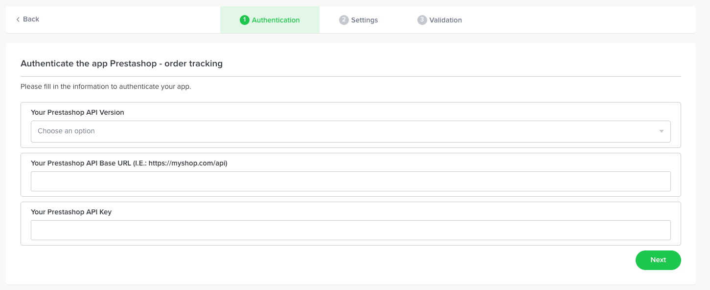 Example: you're using version 1.7, select "Prestashop 1.x" from the dropdown menu. - Base URL to access your Prestashop API : your domain name followed by