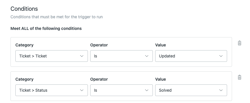 ⚠️⚠️ Do not notify end users of ticket resolution When a ticket is created for archiving purposes, it is created with a solved status in Zendesk. If you have Zendesk triggers that notify end users, remember to exclude these tickets so that they do not trigger a notification email. For example, you can trigger email notification only when the ticket is updated and the status changes to resolved. This way, tickets created with a resolved status will not be affected.