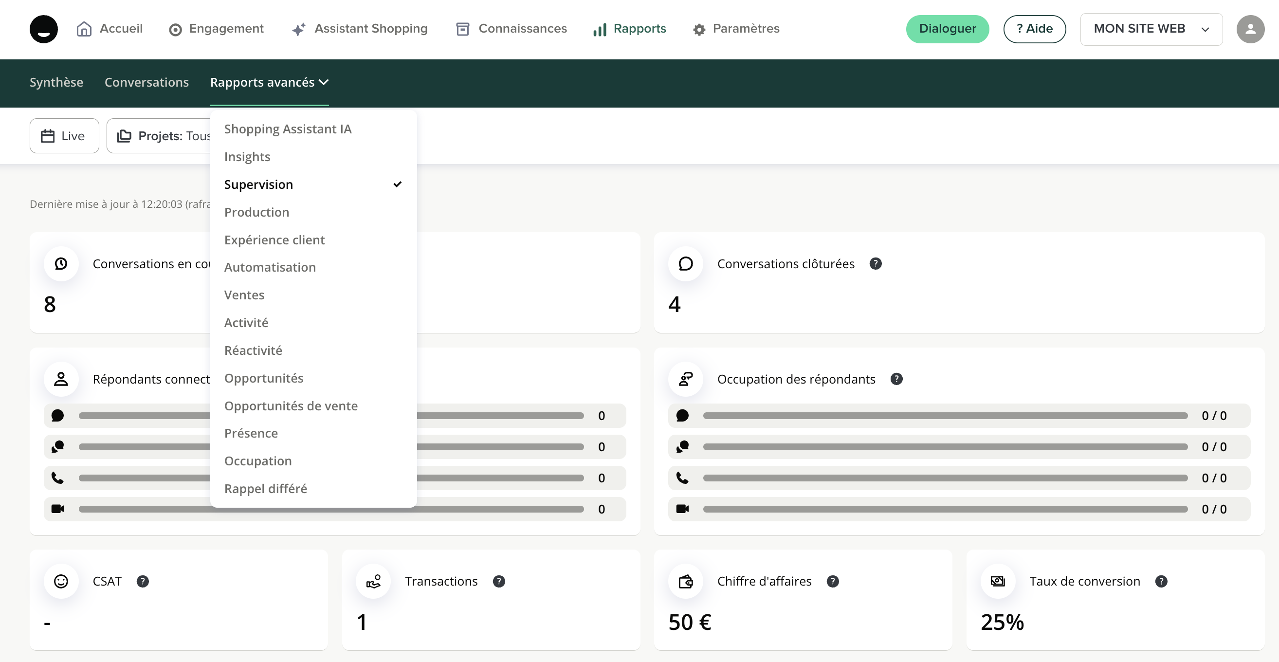 Le rapport Supervision est l’un des deux rapports en temps réel d’iAdvize, avec le rapport Production. En tant que manager ou admin, si vous travaillez et accompagnez une équipe de répondants, il vous sera précieux pour suivre l’activité de la journée et la répartition de votre équipe en un coup d’oeil, et pour suivre les performances individuelles de vos répondants tout au long de la journée.