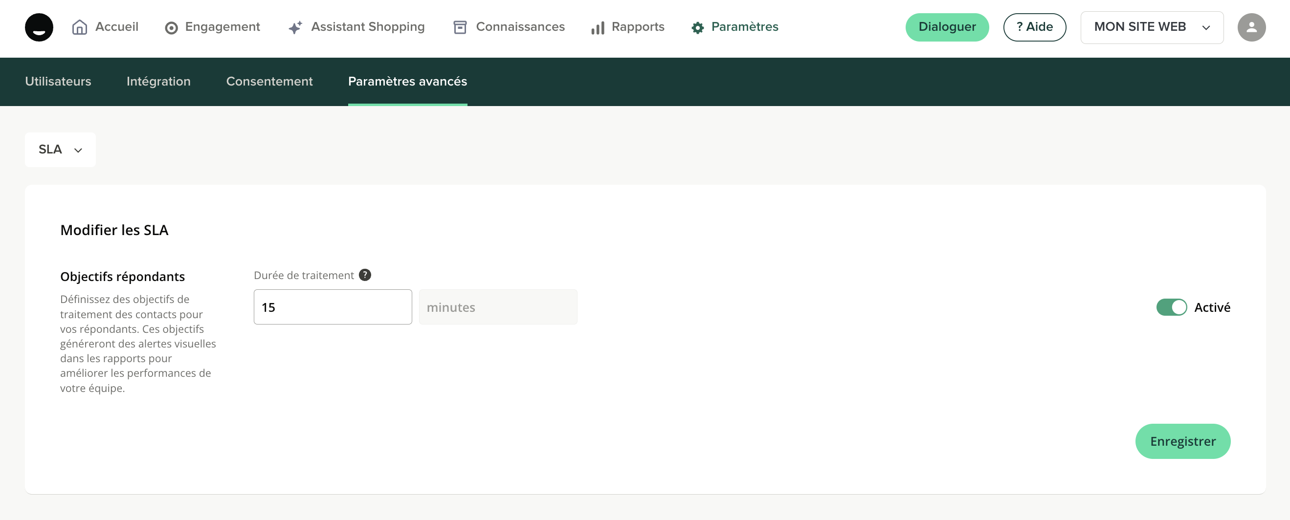 Ou bien vous pouvez définir le seuil et désactiver l'alerte dans la section engagement de l'espace d'administration > Paramètres > Paramètres avancés > SLA :
