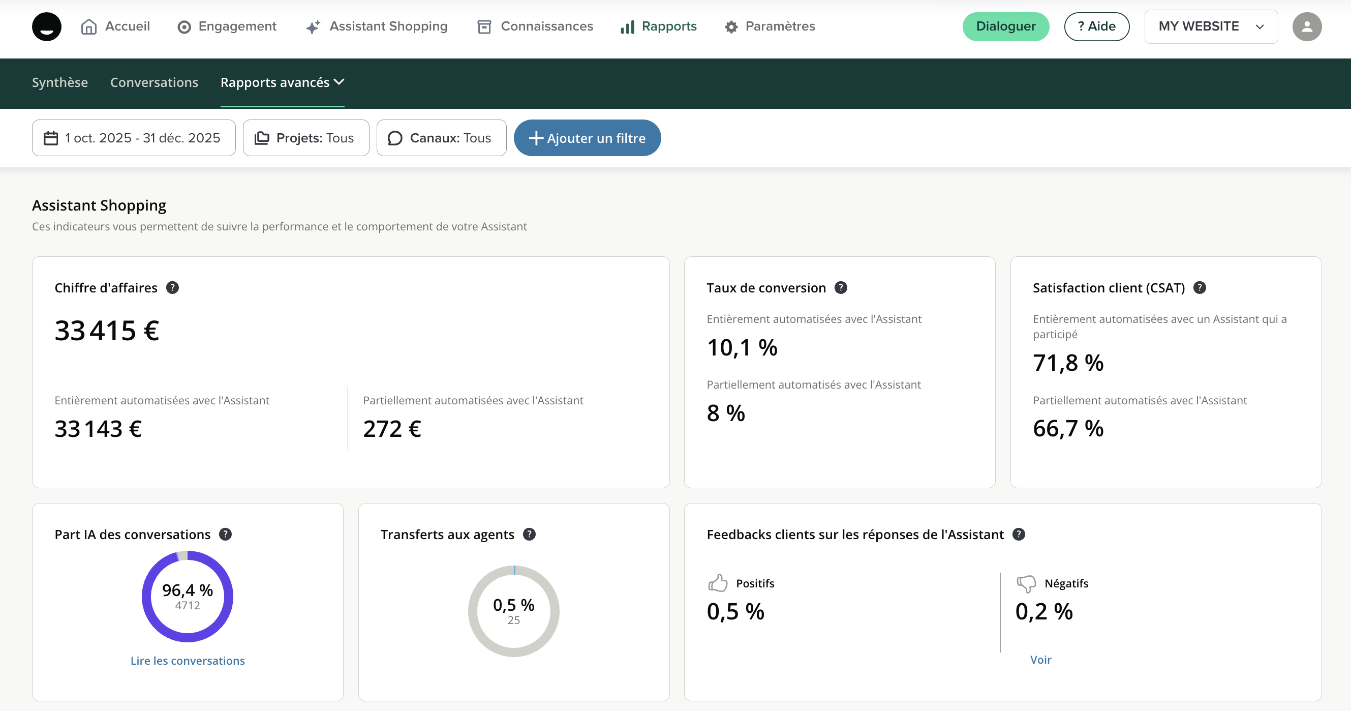 | Feedbacks clients sur les réponses | Pourcentage des messages générés par votre Assistant ayant reçu un feedback positif ou négatif de la part des clients.