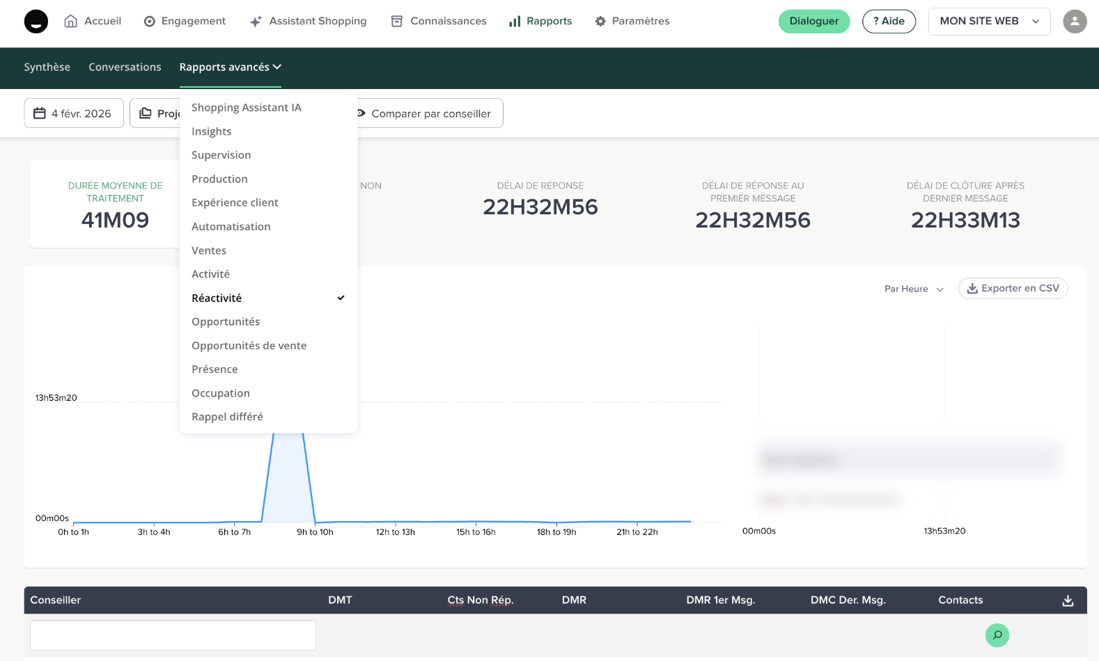 Bien que les rapports “Expérience Client” et “Réactivité” puissent sembler similaires, ils diffèrent fondamentalement dans leur indicateurs et leur méthodologie. Le rapport “Expérience Client” se concentre sur la satisfaction et l'expérience des visiteurs, tandis que le rapport “Réactivité” mesure la performance opérationnelle des conseillers.