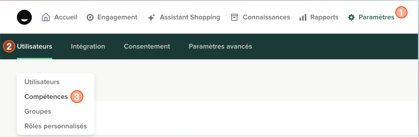 Pour accéder à la page de gestion des compétences, vous devez vous rendre dans la section "Paramètres" puis sous l'onglet Utilisateurs, sélectionnez "Compétences".