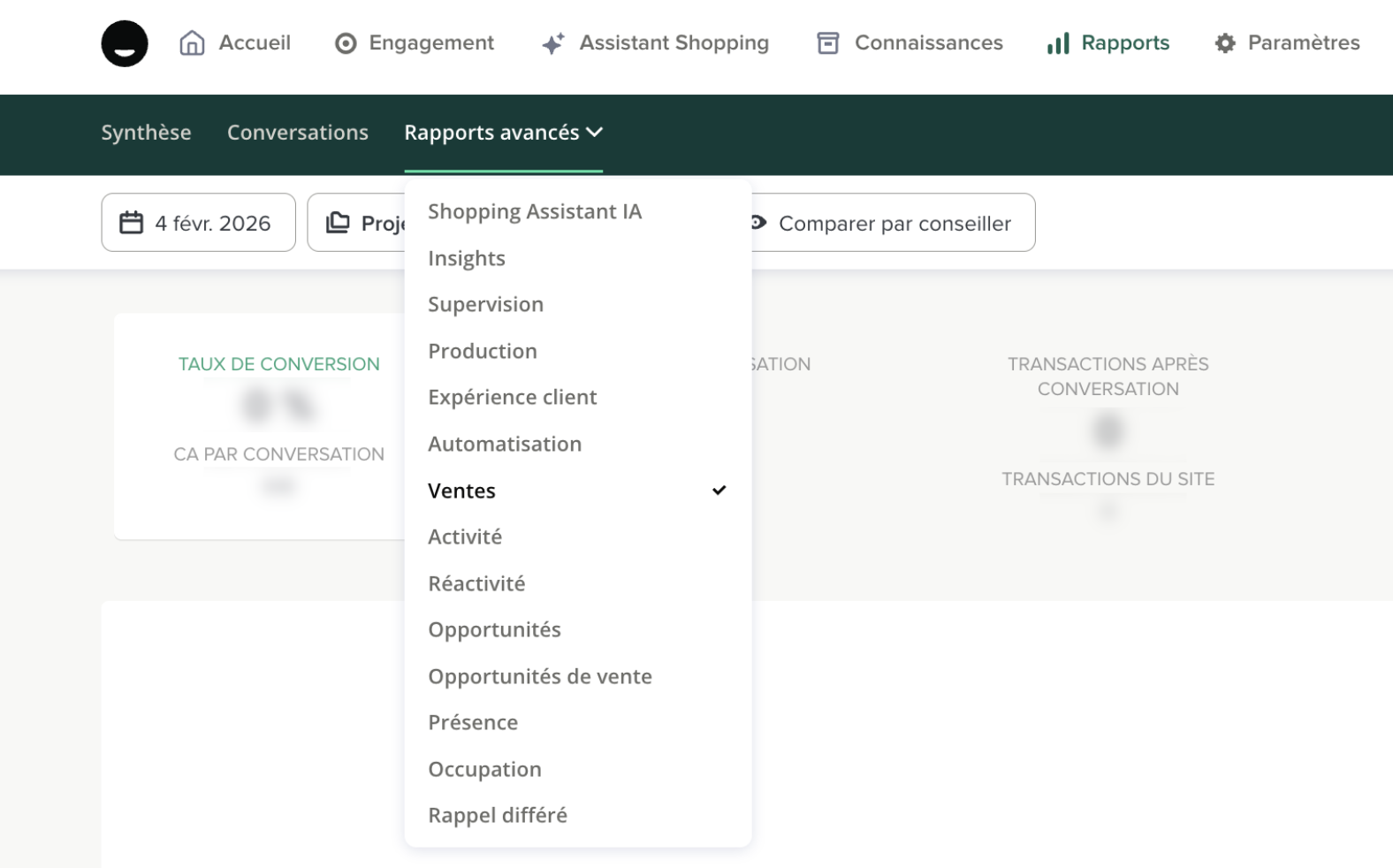 Depuis cette page, visualisez le volume de vente effectué sur votre site et la part des ventes générée via iAdvize. D'autres indicateurs sont disponibles comme le montant du panier moyen ou le délai de transformation après conversation.
