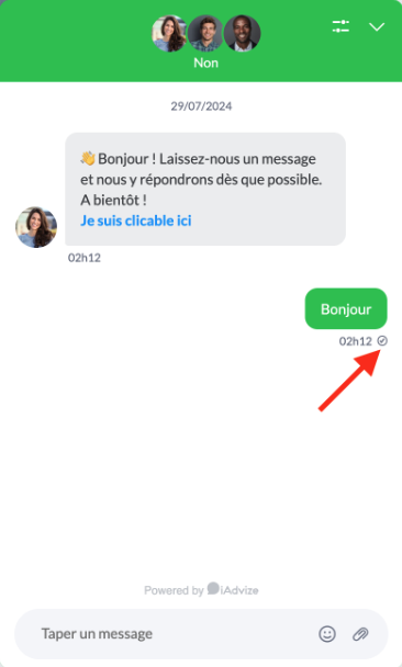 Lors du clic sur la conversation et après l’envoi d’un message, le message envoyé par le visiteur doit inclure cet élément coché: