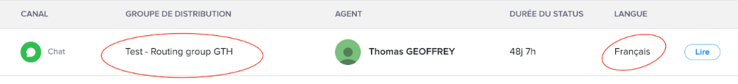 Vérifiez la langue et le groupe de distribution de la conversation. Les agents connectés et disponibles doivent faire partie des mêmes langues et du même groupe de distribution au sein du projet choisi. Recherchez l’agent connecté et disponible dans le groupe de distribution de la conversation créée.