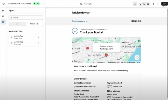 Pour cela, personnalisez le thème souhaité de votre boutique en ligne. Sélectionnez le menu App Embeds à gauche. Ensuite, activez l’option iAdvize tag, cliquez sur la page souhaitée (Checkout et/ou Thank You), puis cliquez sur Enregistrer pour mettre à jour votre thème.